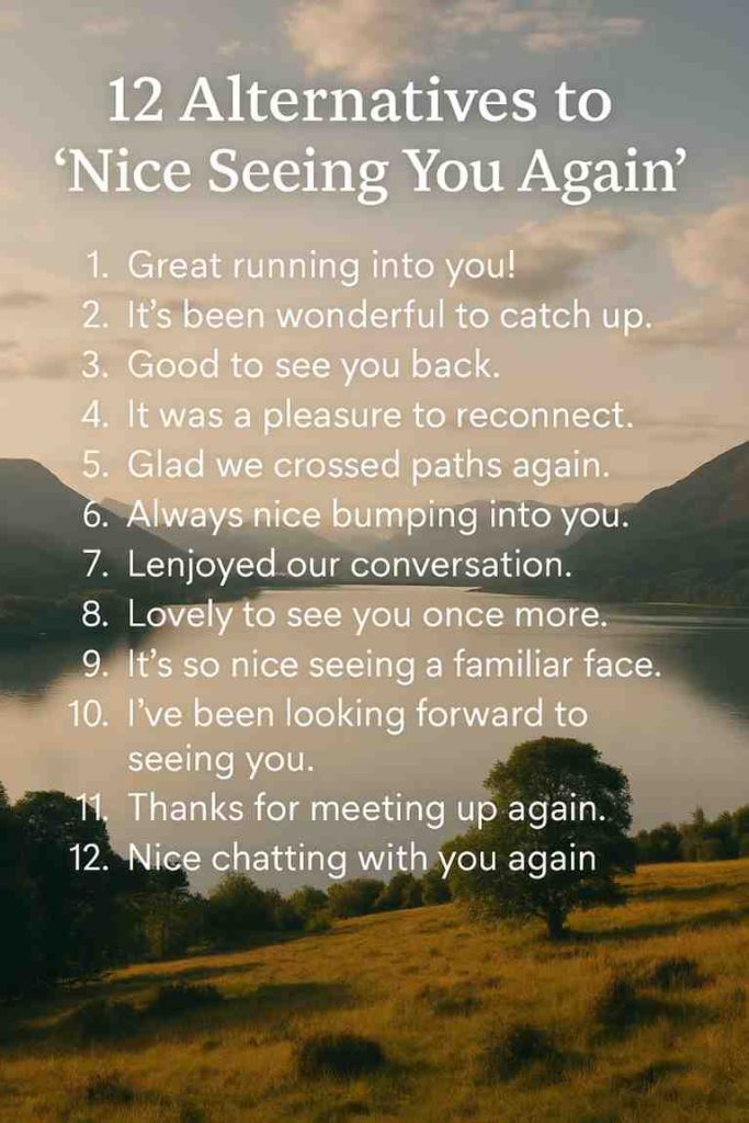 “Nice seeing you again” is a simple phrase, but it can strengthen relationships. It works for friends, colleagues, and even clients. Still, variety in your expressions can make you sound more genuine and help you connect better.